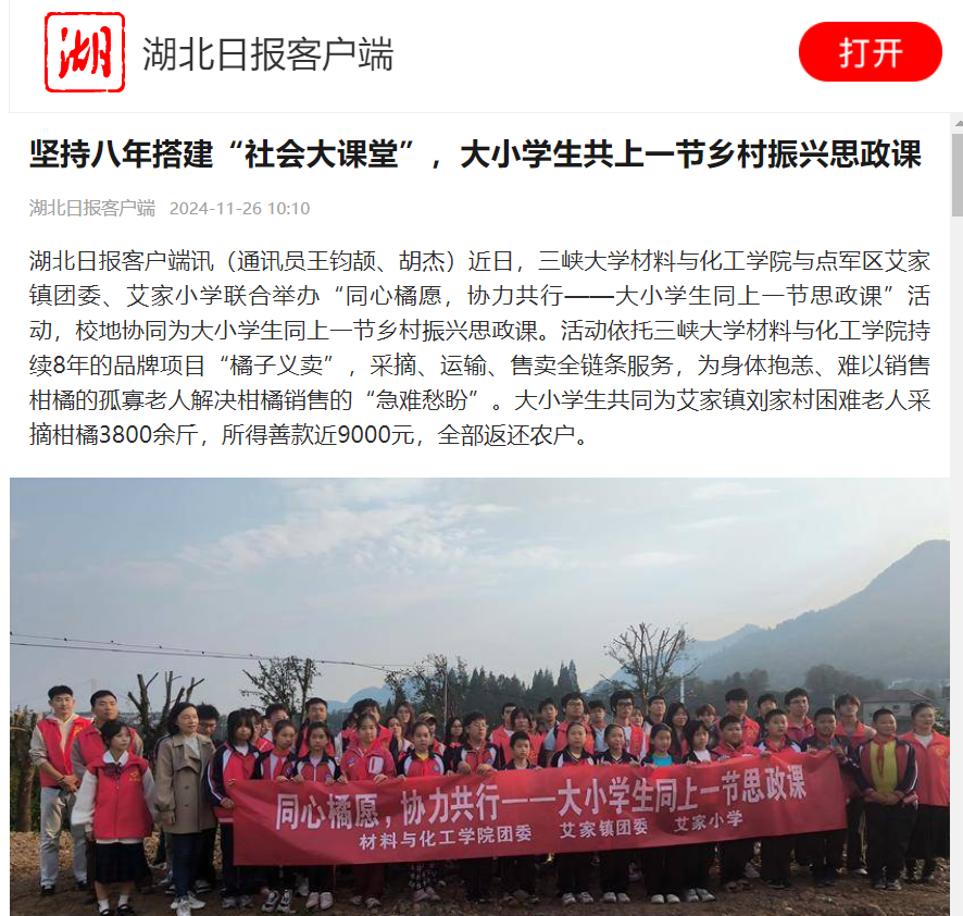 湖北日报客户端讯(通讯员王钧颉、胡杰) 近日,beat365官方网站材料与化工学院与点军区艾家镇团委、艾家小学联合举办“同心橘愿,协力共行——大小学生同上一节思政课”活动,校地协同为大小学生同上一节乡村振兴思政课。活动依托beat365官方网站材料与化工学院持续8年的品牌项目“橘子义卖”,采摘、运输、售卖全链条服务,为身体抱恙、难以销售柑橘的孤寡老人解决柑橘销售的“急难愁盼”。大小学生共同为艾家镇刘家村困难老人采摘柑橘3800余斤,所得善款近9000元,全部返还农户。