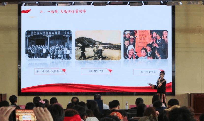 比赛现场,昆明传媒学院大学生讲思政课比赛一等奖获得者杜丽婷以《铸牢中华民族共同体意识的云南实践》为题进行了现场展示。