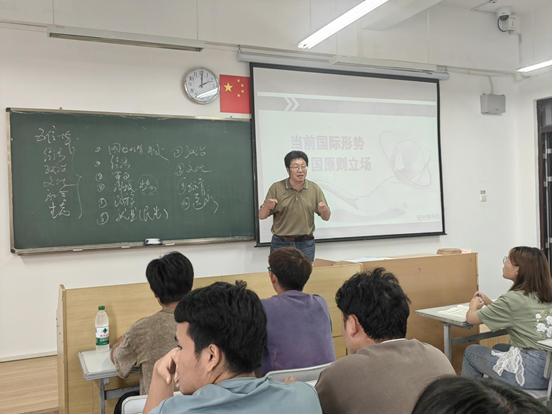 学校党委委员、副校长齐武福以“当前国际形势与中国原则立场”为题,运用思维导图板书的形式从学习“形势与政策”课的重要性、了解国际形势的必要性、如何提高国际视野等方面进行讲授,通过互动交流,引导学生思考课程的教学内容。主要围绕“经济、政治、文化、社会和生态”五位一体的方方面面,让学生认识到“形势与政策”课不仅帮助大学生认清国际国内形势,还引导同学们准确把握党和国家的方针政策,认清国际局势,明确我国的原则立场。