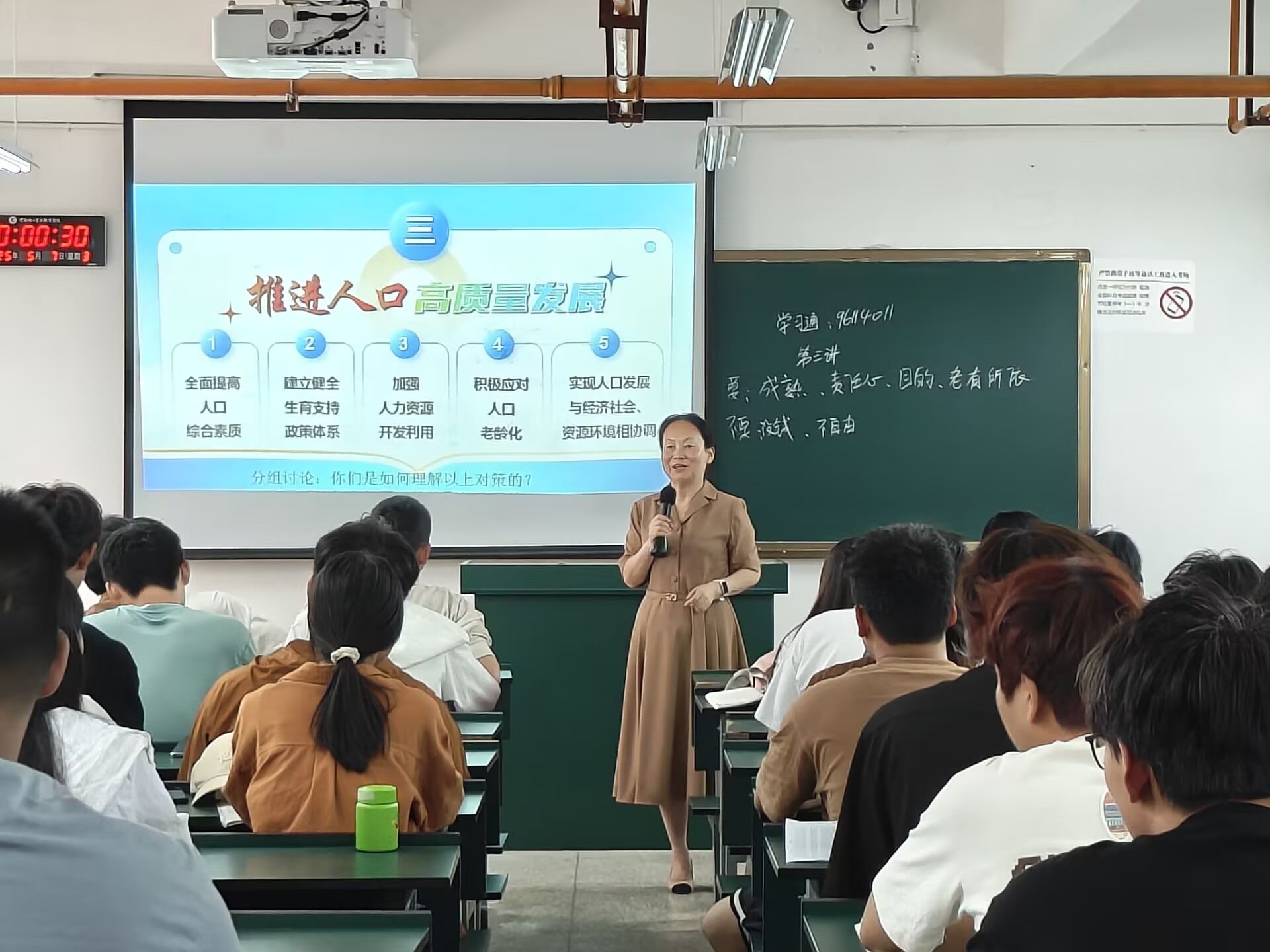 党委副书记、校长陈颖以“以人口高质量发展支撑中国式现代化”为题,从“高质量发展的衡量标准有哪些?中国式现代化的特征有哪些?”两个问题导入,引发学生思考人口高质量发展与中国式现代化之间的关系。她介绍了中华人民共和国成立以来我国人口发展的历程以及当下面临的新形势,并组织学生围绕“要小孩更好还是不要更好”“如何看待我国实施的计划生育政策”“如何看待人口负增长带来的影响”“如何正确看待我国人口红利问题”四个方面开展小组讨论。